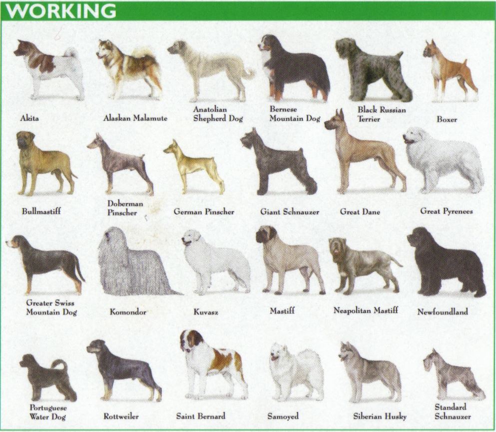 Put in other terms, dogs of the Working Group were bred to perform such jobs as guarding property, pulling sleds and performing water rescues. They have been invaluable assets to man throughout the ages. The Doberman Pinscher, Siberian Husky and Great Dane are included in this Group, to name just a few. Quick to learn, these intelligent, capable animals make solid companions. Their considerable dimensions and strength alone, however, make many working dogs unsuitable as pets for average families. And again, by virtue of their size alone, these dogs must be properly trained.
