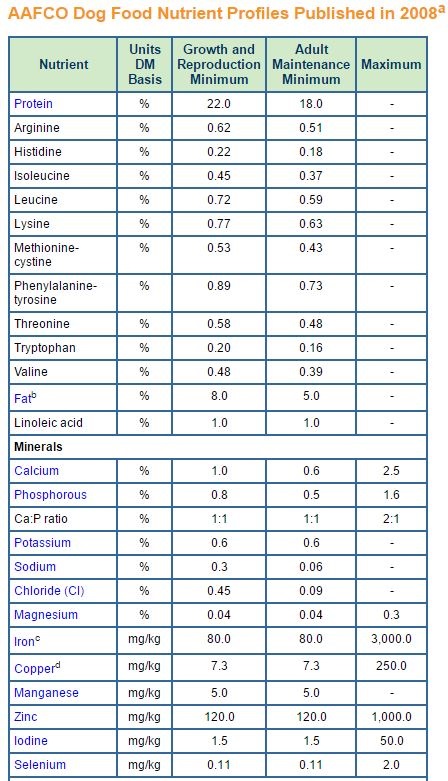 There are now two separate nutrient profiles for dogs - one for growth (puppies) and one for adult maintenance. Maximum levels of intake of some nutrients have been established for the first time because of concern that overnutrition, rather than undernutrition, is a bigger problem with many pet foods today. The standards include recommendations on protein, fat, fat soluble vitamins, water soluble vitamins, and mineral content of foods.
