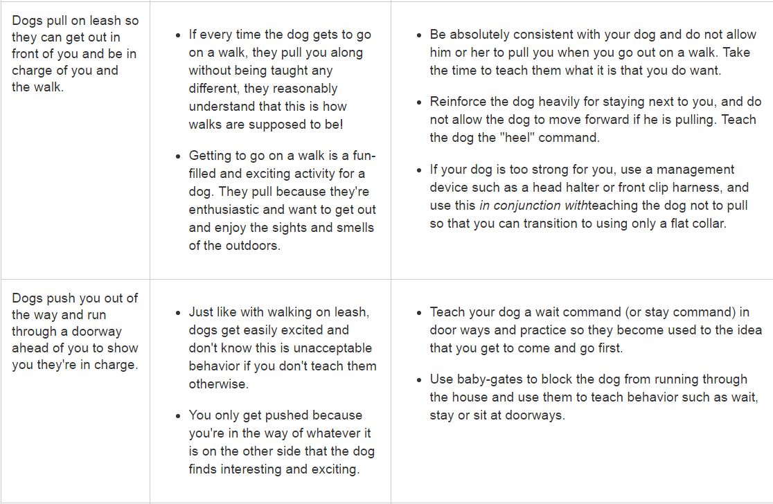 Rather than dominance, it is most often a lack of clear interspecies communication that leads to behaviors we find troubling. It is the human's responsibility to teach our dogs the behaviors that we find appropriate, and reward them when they do the things we like. Just as importantly, it is our role to show them which behaviors are not appropriate in a constructive and compassionate manner that does not lead to further anxiety on the dog's part.