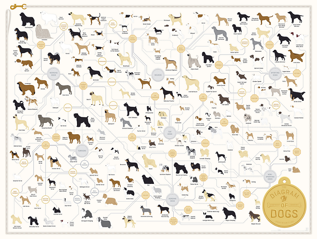 Delineating nearly every standard pure-bred pooch, this mutt-ticulously hand-illustrated chart features 181 dog breeds, from Toy pups like the Brussels Griffon to Working dogs like the Alaskan Malamute, to well-known K-9 classics like Golden Retrievers and Terriers.